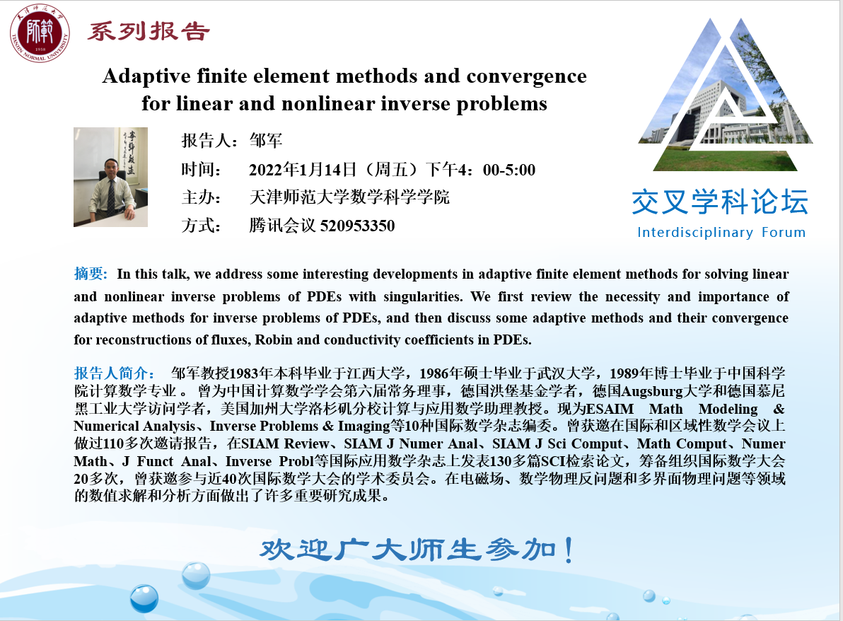 【预告】学术报告(2022-1)1月14日报告——Adaptive finite element method and convergence for linear and nolinear inverse problem