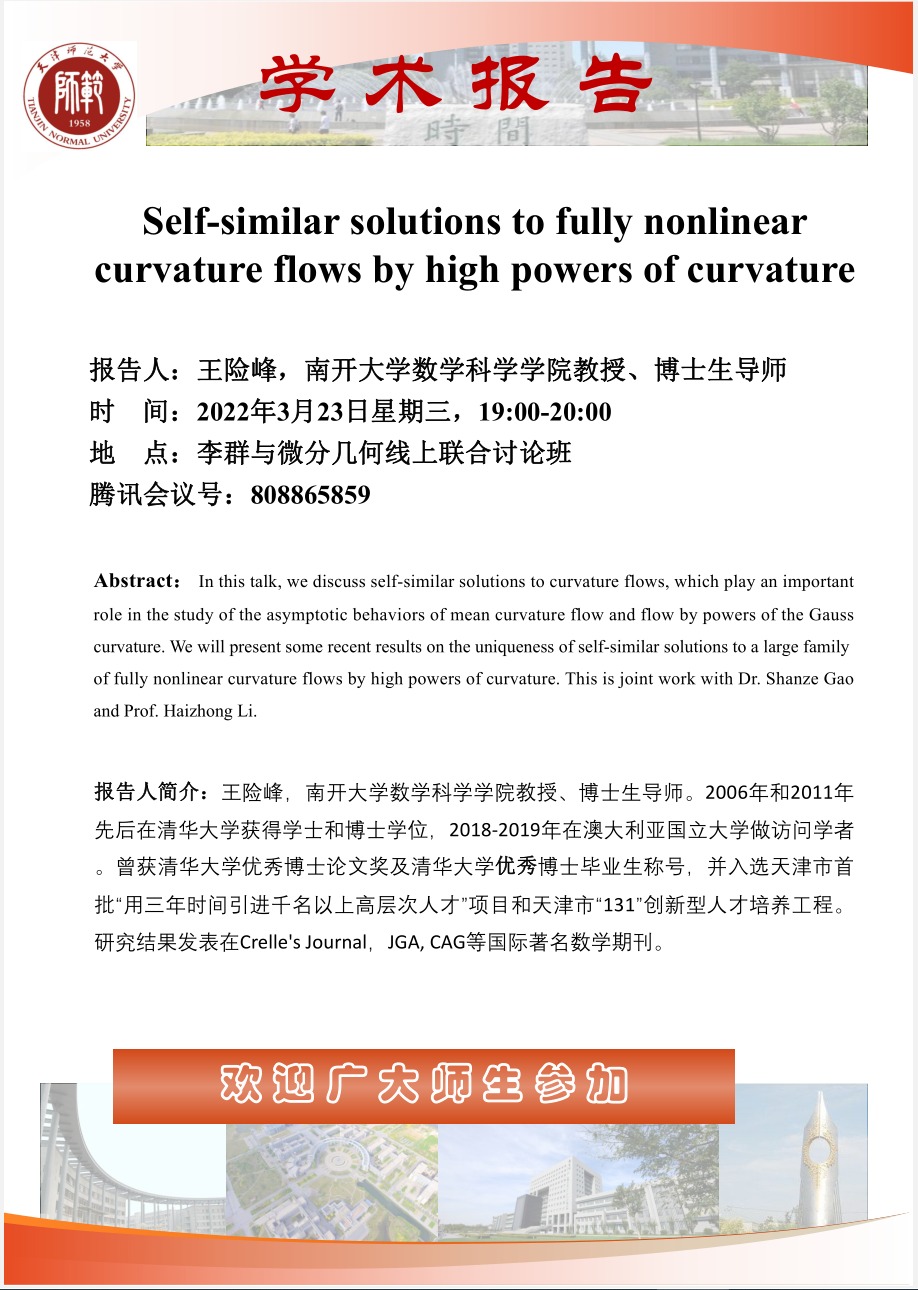【预告】学术报告(2022-2)3月23日报告——Self-similar solutions to fully nonlinear curvature flows by high powers of curvature