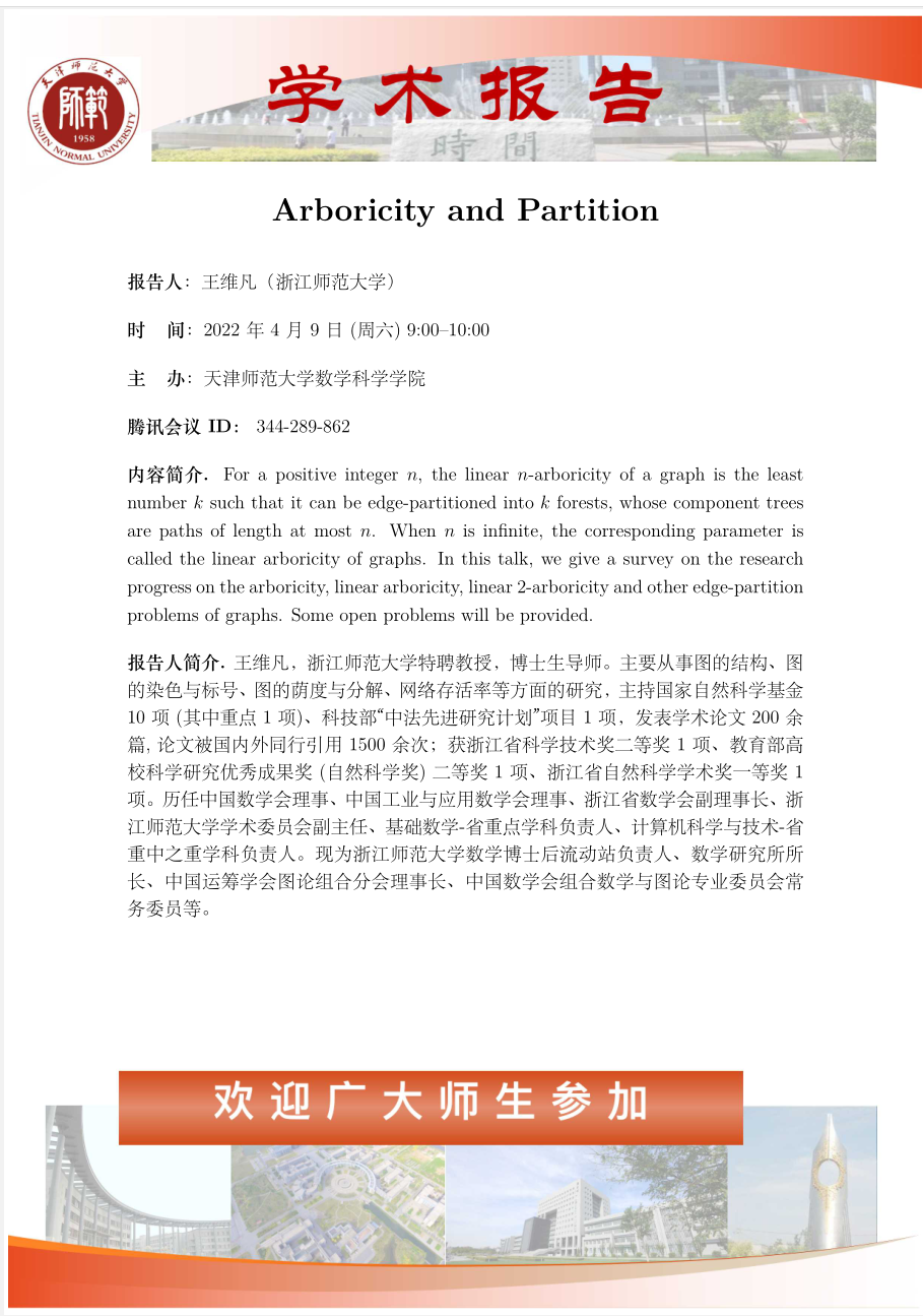 【预告】学术报告(2022-3)4月9日报告--Arboricity and Partition