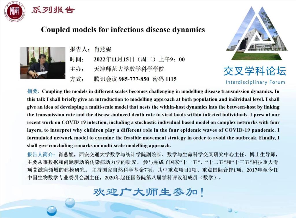 【预告】学术报告(2022-18)11月15日报告--Coupled models for infectious disease dynamics