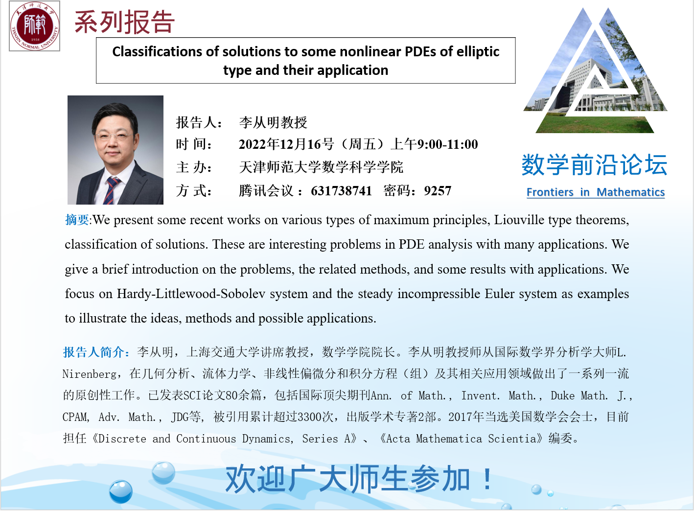 【预告】学术报告(2022-20)12月16日报告--Classifications of solutions to some nonlinear PDEs of elliptic type and their application