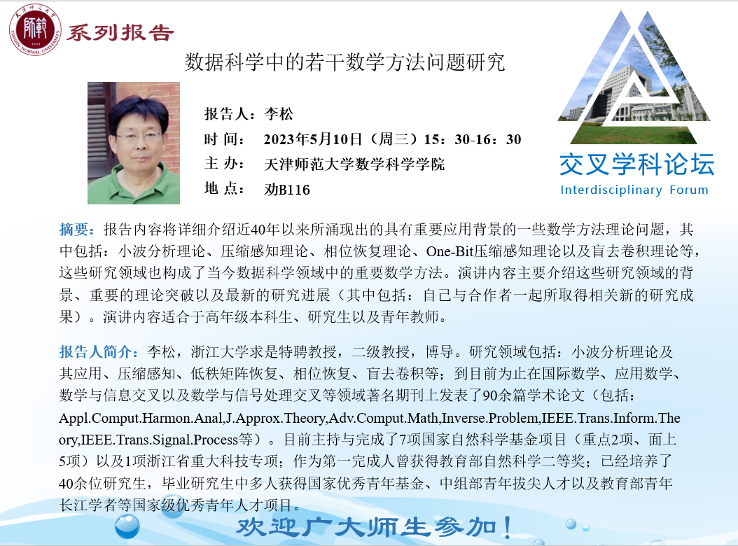 【预告】学术报告(2023-5)5月10日——数据科学中的若干数学方法问题研究