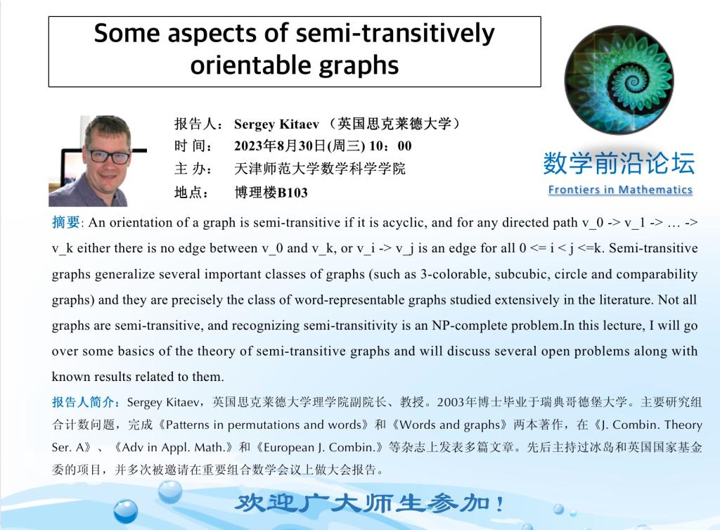 【预告】学术报告(2023-30)8月30日—Some aspects of semi-transitively orientable graphs