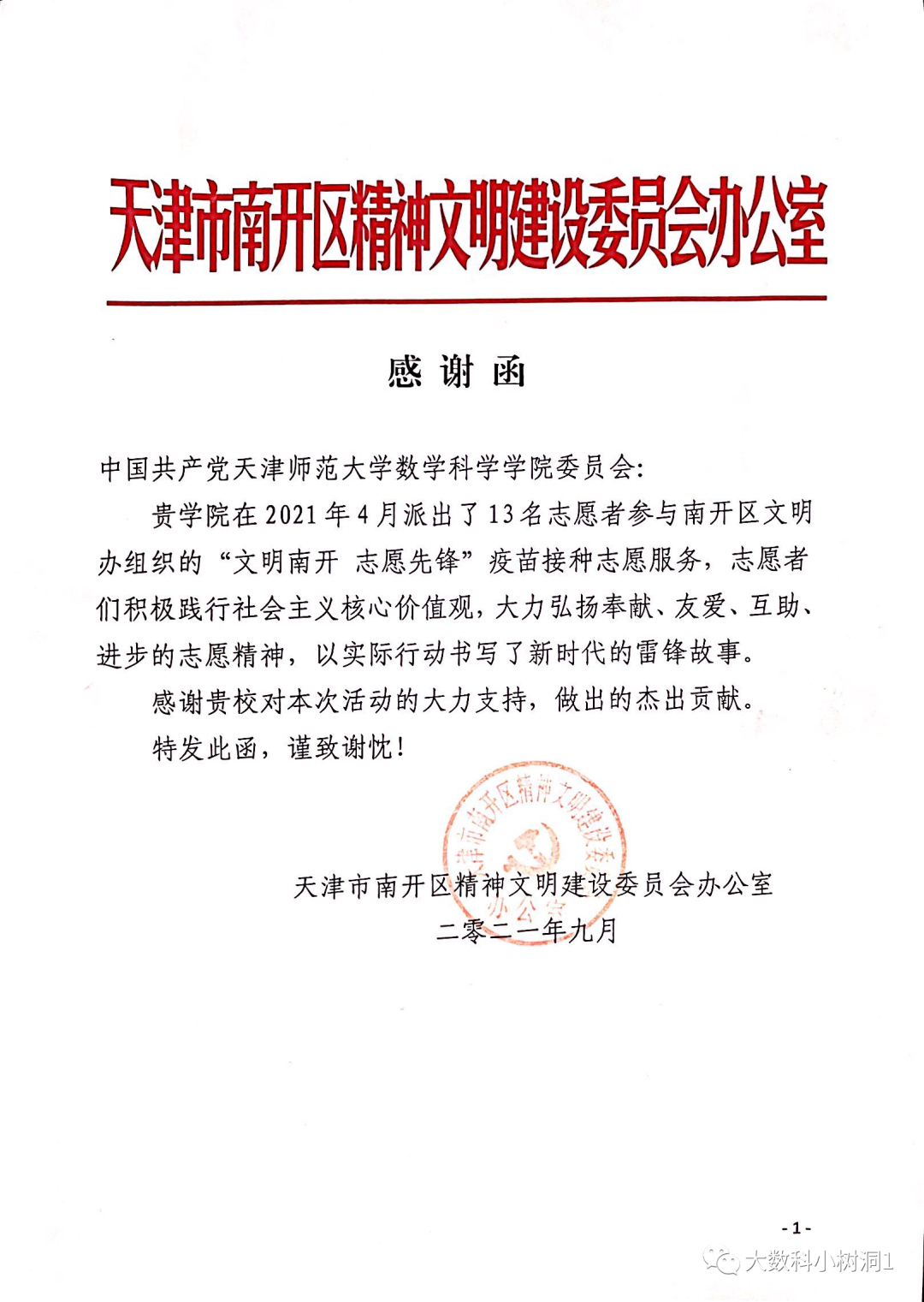 纸短情长 一封来自南开区精神文明建设委员会办公室的感谢信